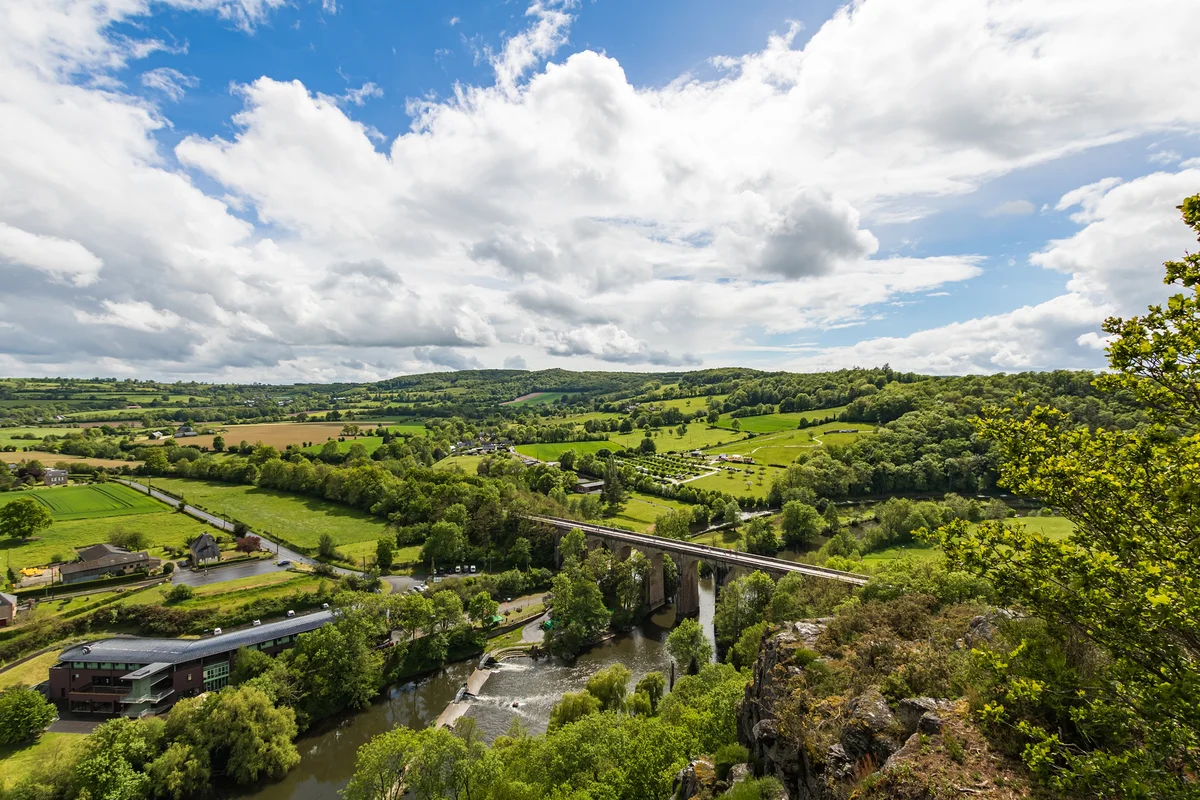Sur les bords de l'Orne, un parapentiste décolle des Rochers des Parcs et glisse sans bruit au-dessus de la vallée. En contrebas, des kayakistes pagaient vers le viaduc de la Lande, ce pont ferroviaire de 1866 qui enjambe le fleuve à trente mètres de hauteur.