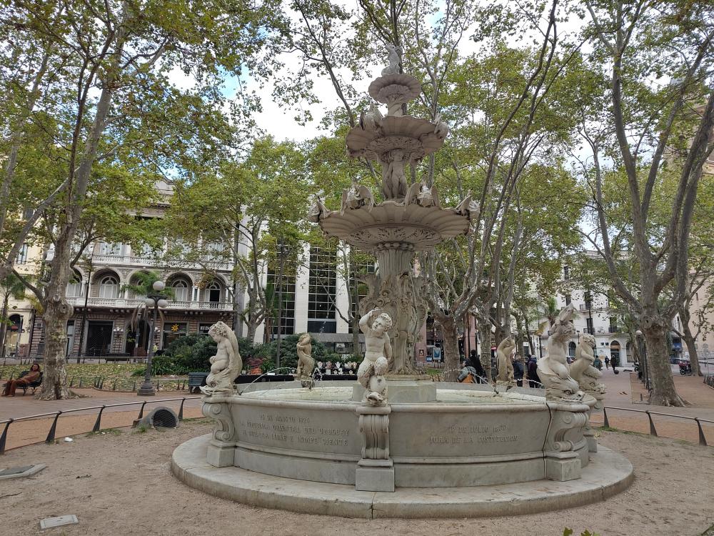 La très belle fontaine de marbre qui trône sur la place est la première fontaine publique de la ville. En 1871, lorsque fut signé le contrat d’approvisionnement en eau courante de la ville, elle fut incluse dans celui-ci et son service démarra en même temps que l’eau courante de Montevideo.