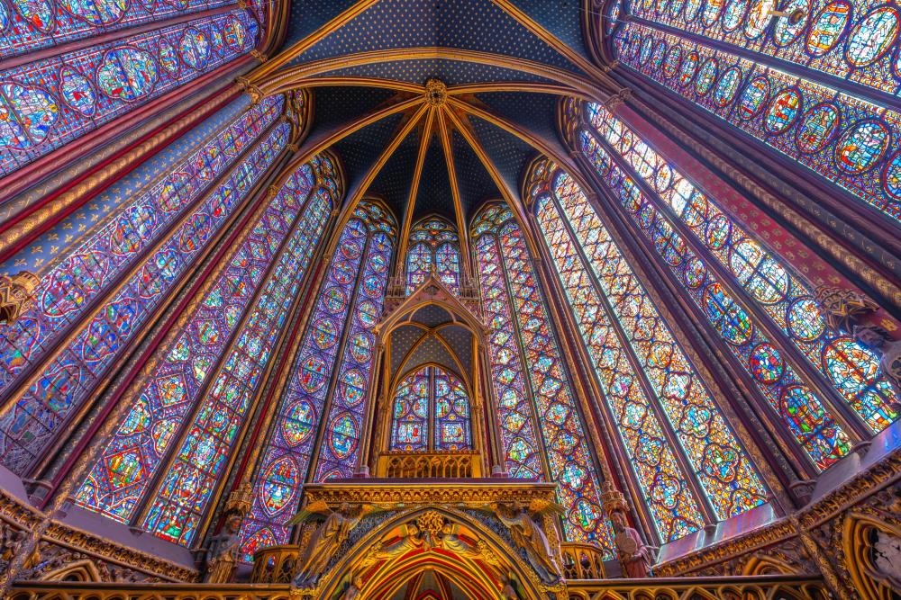 Ce qui fait la renommée de la chapelle, ce sont ses vitraux du XIIIe siècle, parmi les plus anciens et les plus complets d’Europe. Sur 15 verrières culminant à 15 mètres de hauteur, pas moins de 1113 scènes bibliques se déploient dans une palette de couleurs flamboyantes. Elles racontent l’histoire du monde, de la Genèse jusqu’à la rédemption, selon une lecture verticale. À certaines heures du jour, la lumière filtrée par ces vitraux donne à l’espace une atmosphère quasi mystique, soulignant la dimension spirituelle du lieu.
