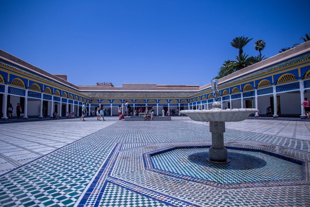 Édifié entre 1866 et 1900 par le grand vizir Si Moussa puis son fils Ba Ahmed, ce palais incarne l'apogée de l'architecture résidentielle marocaine. Son nom signifie "la Brillante", en hommage à l'une des épouses favorites du vizir. Avec ses 160 pièces réparties sur près de 8000 m², il témoigne de la puissance et du raffinement de la cour alaouite à la fin du XIXe siècle.
