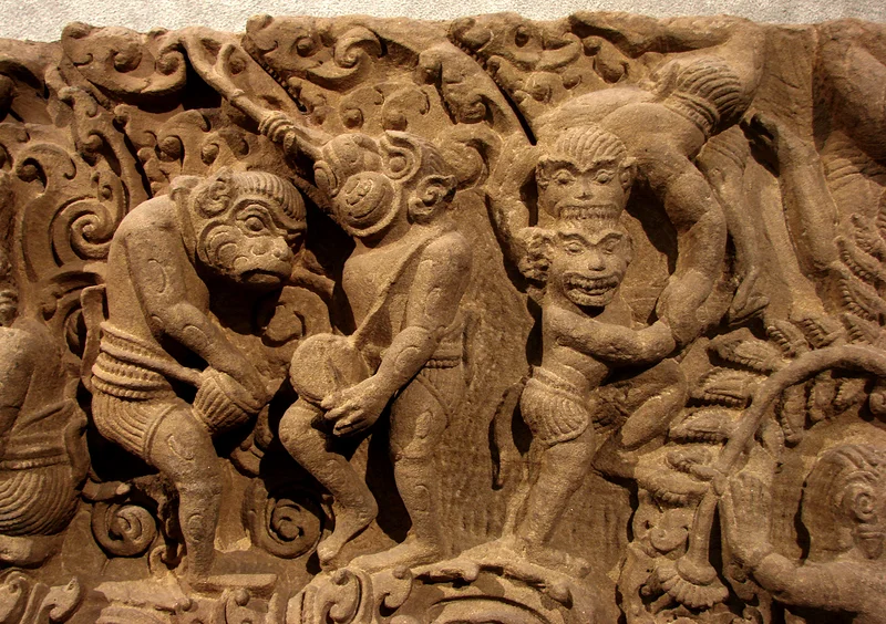 La première salle est réservée aux nombreux bas reliefs, statues de pierre, stèles couvertes d’écriture et têtes de dévas. Ces bas reliefs évoquent très souvent les légendes religieuses de l’hindouisme, religion adoptée lors de l’époque angkorienne, avant que le bouddhisme ne soit choisi comme la religion officielle des Khmers. Le Mahâbhârata, ou barattage de la mer de lait, est souvent représenté. C’est l’un des deux poèmes guerriers épiques fondateurs de l’hindouisme. Un énorme lingua de pierre est également présent. Il est le symbole du principe masculin, souvent dénommé yang en Asie.