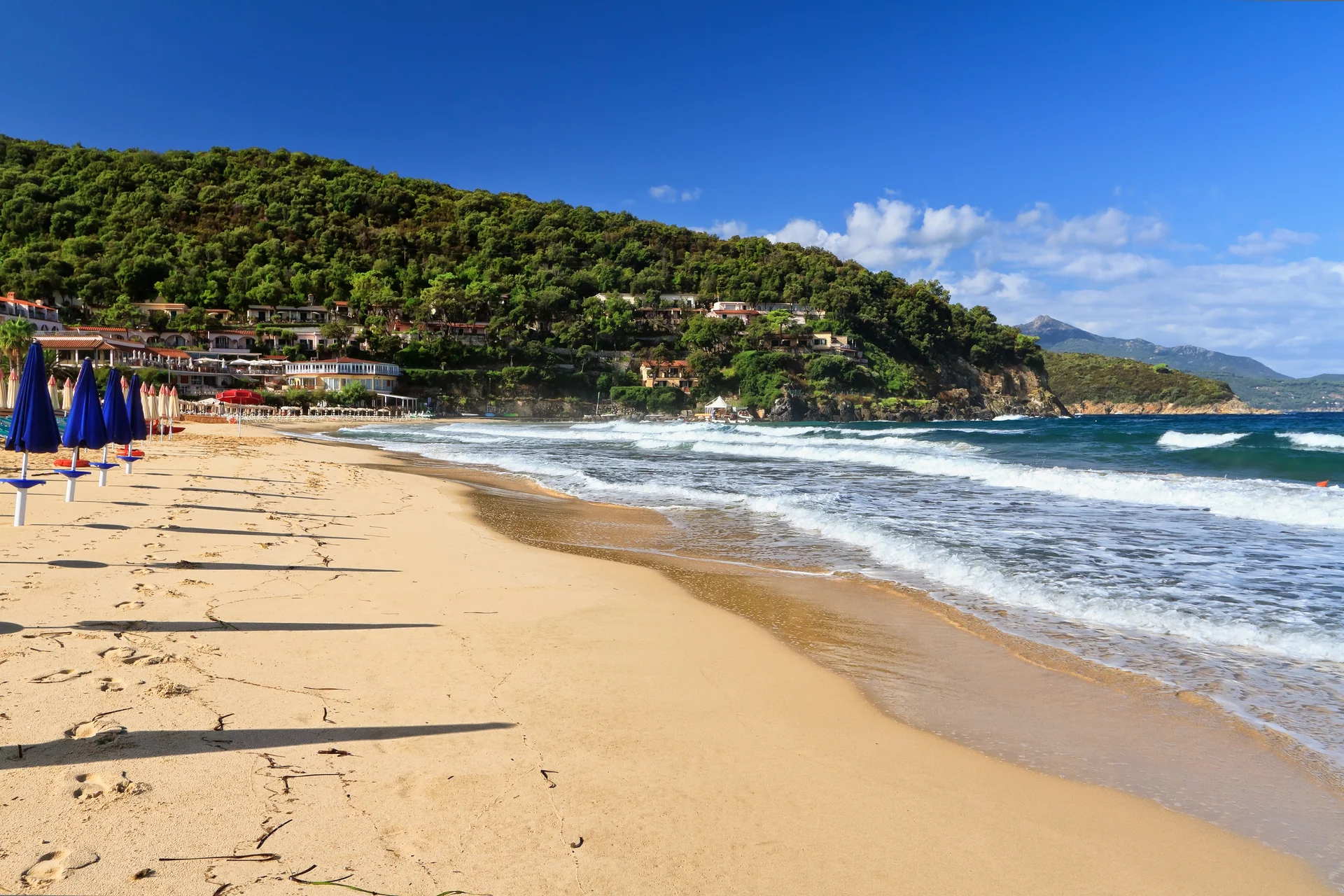 Le golfe est protégé des vents du sud, ce qui garantit une eau calme la majeure partie de la saison. En toile de fond, les silhouettes du Monte Capanne et du Monte Perone, les deux plus hauts sommets de l'île, ferment l'horizon vers l'intérieur des terres.
