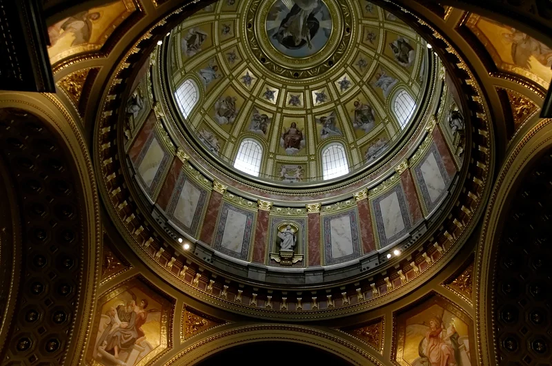 Dès l'entrée, l'intérieur somptueux impressionne par ses marbres colorés, ses fresques, et surtout sa magnifique coupole centrale, décorée de dorures éclatantes. Cette coupole est accessible aux visiteurs qui peuvent ainsi bénéficier d'une vue panoramique exceptionnelle sur Budapest.