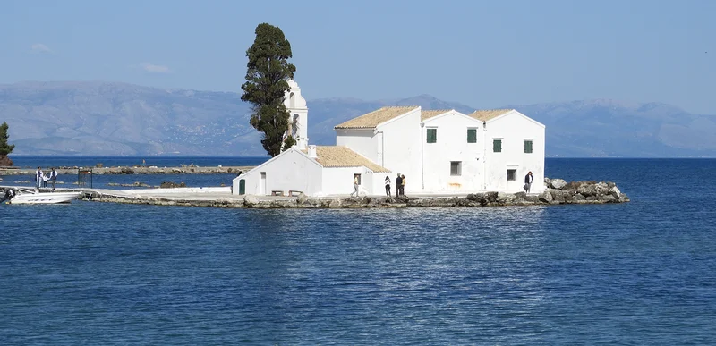 Au sud de la ville de Corfou, la presqu'île Kanoni est un petit bijou qui doit son nom aux canons laissés sur place par les troupes de Napoléon. En arrivant, on ne voit que lui, semblant flotter sur la mer, le Monastère des Vlachernes est au bout d'une digue en pierre où quelques bateaux sont amarrés. Toutes les brochures touristiques en ont fait une star et ses murs blancs d'où surgit un arbre occupent entièrement l'îlot. De la fin du XVIIIe siècle à 1980, le monastère fonctionnait en tant que tel. Depuis, seule l'église Panagia Vlahernon est utilisée pour les offices et les célébrations. Ouverte aux visiteurs, elle est un lieu de recueillement où règne une atmosphère très particulière. Sublime bâtiment avec un clocher, elle est entourée d'une minuscule cour bordée de pierres d'où la vue est remarquable, l'impression d'être entré dans un tableau est tenace. Plus loin, sur un îlot uniquement accessible par bateau, l'église du Pantocrator se distingue entre des arbres denses : c'est l'île de la Souris.