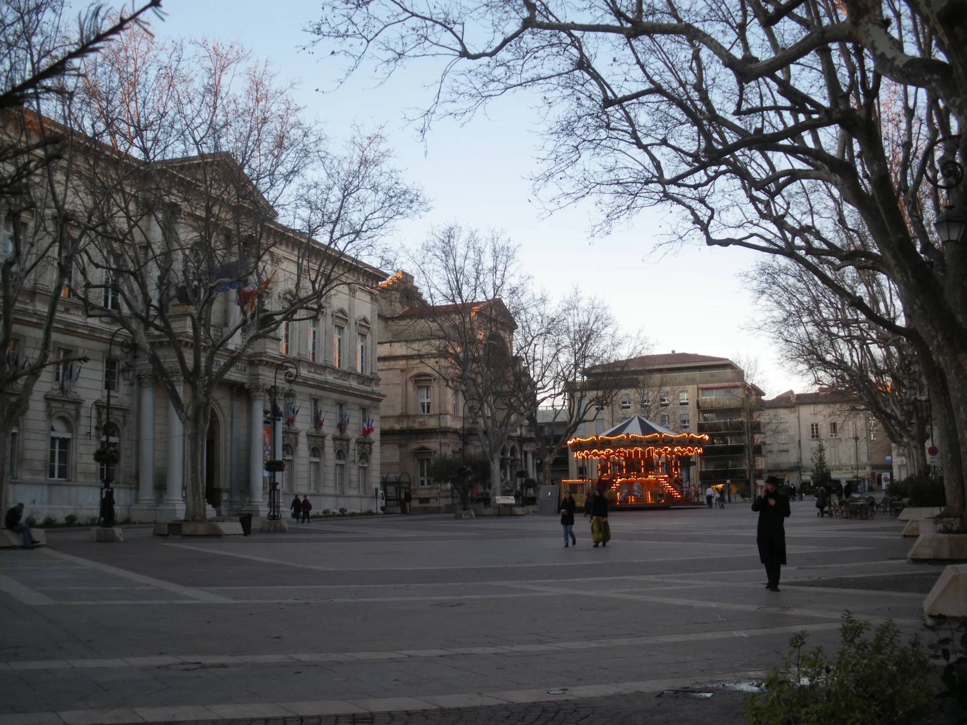 Ancien forum d’Avenio, nom antique donné à Avignon, la place devint au moyen-âge la place du Mazel en référence aux macelliers, les bouchers qui s’y installaient les jours de marché, puis la place du Reloge. Remarquez, au carrefour de la rue Ferruce, l’imposant bâtiment historique abritant l’hôtel de ville. Il s’agit de la Livrée d’Albano, ancienne abbaye des dames bénédictines de Saint-Laurent, qui accueillit de nombreux cardinaux. En 1471, on y installa une horloge décorée de jacquemards, petits automates en bois marquant les heures d’un tintement de cloche. Au XVIIe, XVIIIe et XIXe siècles, la place connue de nombreux agrandissements. La belle symétrie telle qu’on la connait est l’œuvre de l’architecte Jean-Baptiste Franque. Parmi les bâtiments remarquables qui ornent la place, remarquez le théâtre municipal, entouré des statues de Molière et de Corneille, ainsi que la Banque de France. Pratique : vous y trouverez l’office du Tourisme.