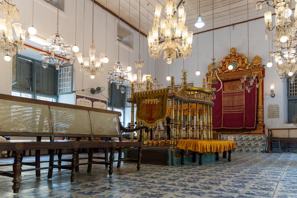 La galerie réservée aux femmes, ornée de colonnes dorées, se sépare de la salle principale par une cloison ajourée appelée mechitza. Au centre, la bimah surélevée avec ses balustrades en laiton sert aux prières du soir. L'ensemble architectural respecte les traditions sépharades tout en intégrant l'artisanat local keralaïs.