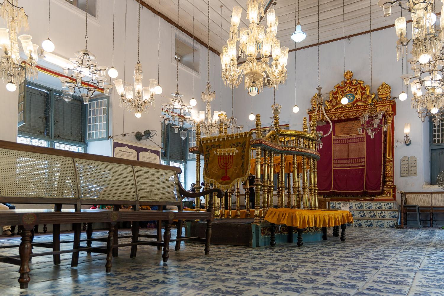 Le quartier environnant, surnommé Jew Town, aligne ses boutiques d'antiquités, d'épices et d'artisanat. Les ruelles étroites conservent l'atmosphère d'un shtetl tropical où les panneaux hébreux côtoient les enseignes en malayalam.