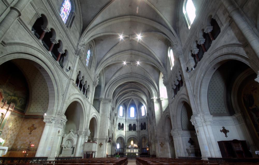L'architecte Henri Antoine Révoil habille l'intérieur entre 1877 et 1882 dans un style romano-byzantin alors en vogue. Les voûtes d'ogives et le vaisseau unique datent quant à eux de la reconstruction du XVIIe siècle, orchestrée par l'évêque Anthyme-Denis Cohon.